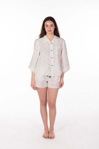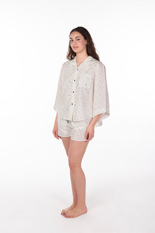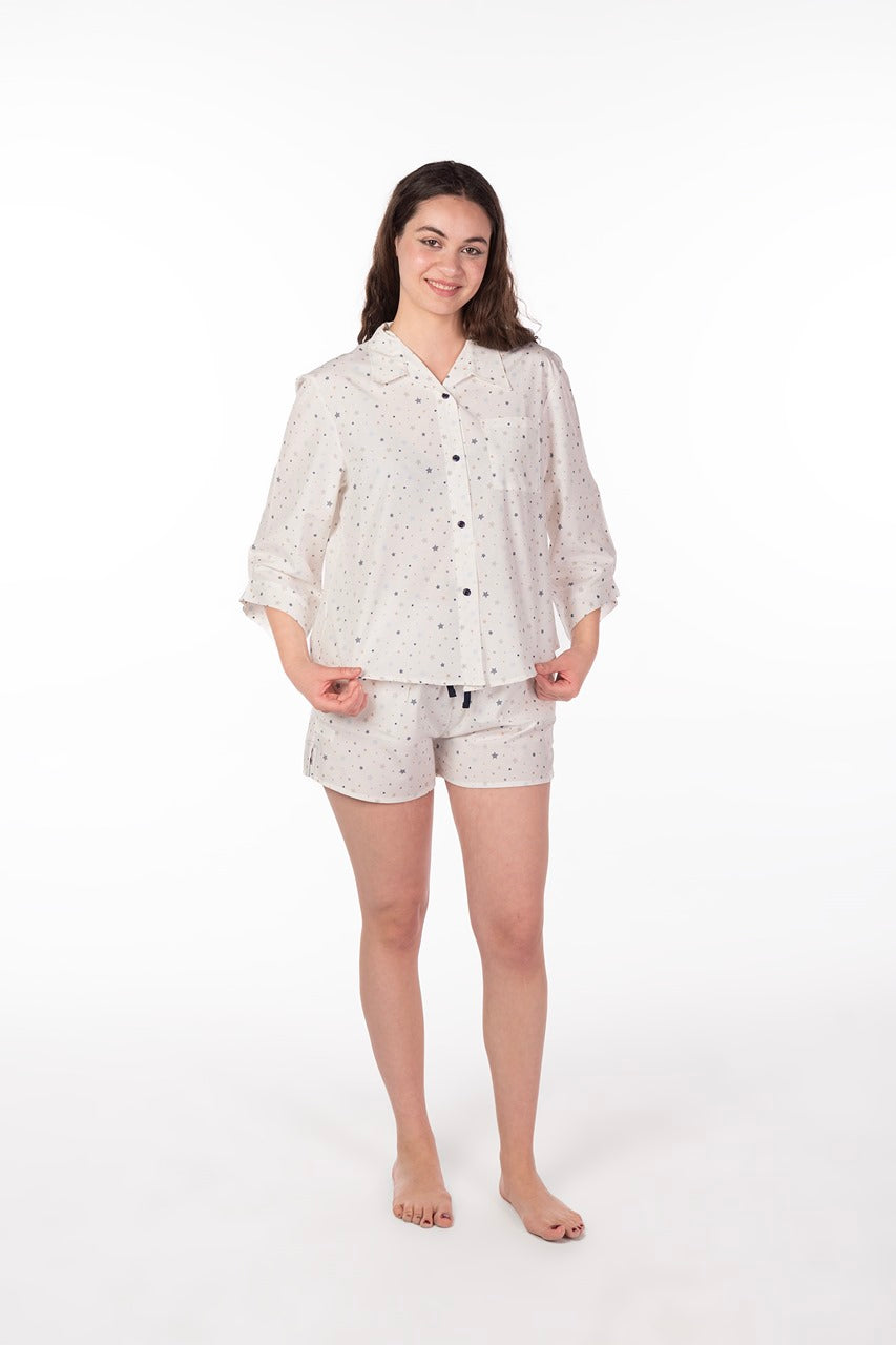 اكتشف بيجامة فيشي ستار البيضاء، حيث تلتقي الأناقة بالراحة. هذه البيجامة الفاخرة ذات الأزرار مصنوعة من قطن 100% عالي الجودة، مما يضمن لك تجربة نوم هانئة وناعمة.