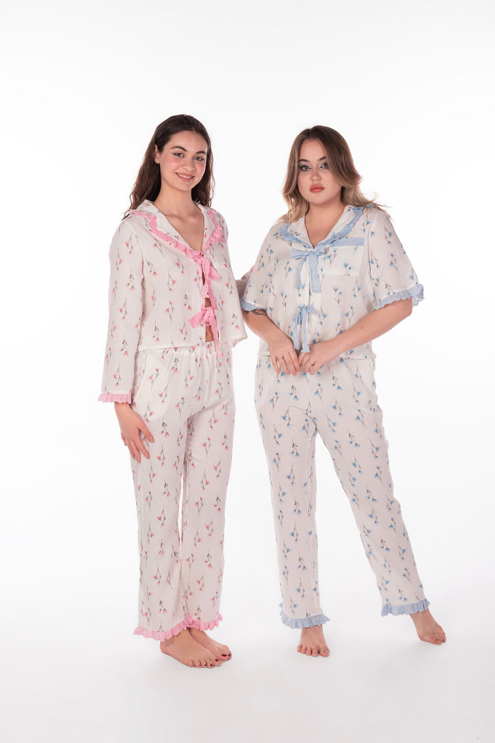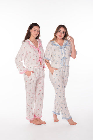 استمتعي بأقصى درجات الراحة والأناقة مع بيجاماتنا الرائعة بنقشة الزهور. مصممة بلون وردي فاتح ولون أزرق فاتح مهدئ، تضفي هذه البيجامات لمسة من الأناقة على ملابس نومكِ.